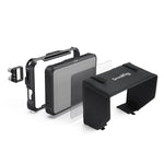 SmallRig Atomos Shinobi 7 Cage (Kit) 3456 is an aluminium-alloy full cage equipped with various accessory mounting points. It comes with NATO rail on top and bottom, 1/4'-20, 3/8'-16 threaded holes for quick release and stable attachment of magic arm and monitor mount (ID: 2116, 2071, 2028, 2385, 2347) and suits baseplate (ID: 1598, 3204, 2107) on the top for V-mount battery and wireless image transmitter. The cage allows mounting the original Atomos sun hood and Built-in sun hood on the top and bottom and features 1/4''-20, 3/8'-16 threaded holes on the side for the handle (ID: 2913, 2914, HSN2093). Its cable clamp protects the monitor interface. There are four shoulder strap holes that fit ID: 2793, making it easy to carry the monitor over your shoulder and quick to remove the strap. The kit also includes a quick-absorbing and bubble-free screen protector (ID: 3455) to protect the monitor screen from fingerprints, water spray, dust, scratches, and knocks.